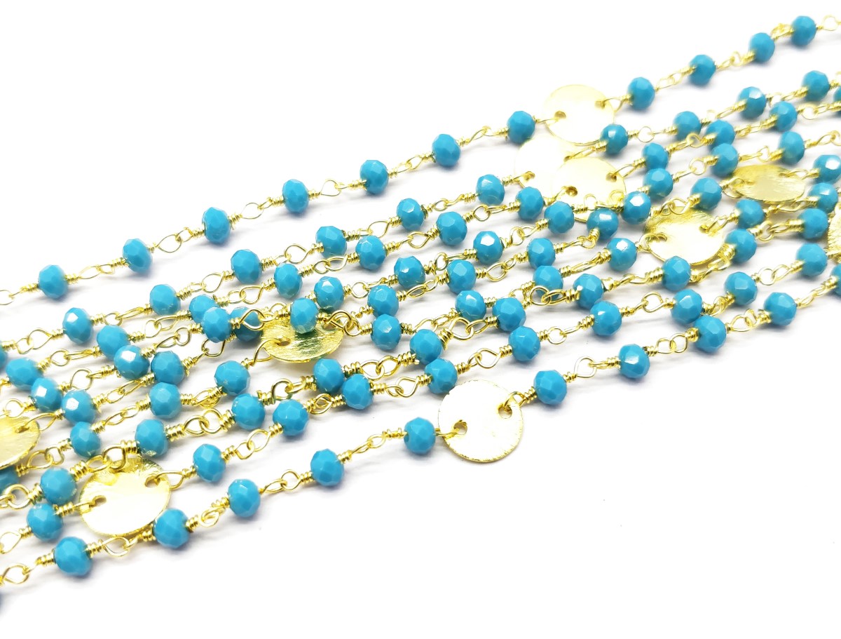 3 Feet Blue Chalcedony 3-3.5mm Rondelle Faceted Round Charm 24K Gold Plated Rosary Chain (CH-91)