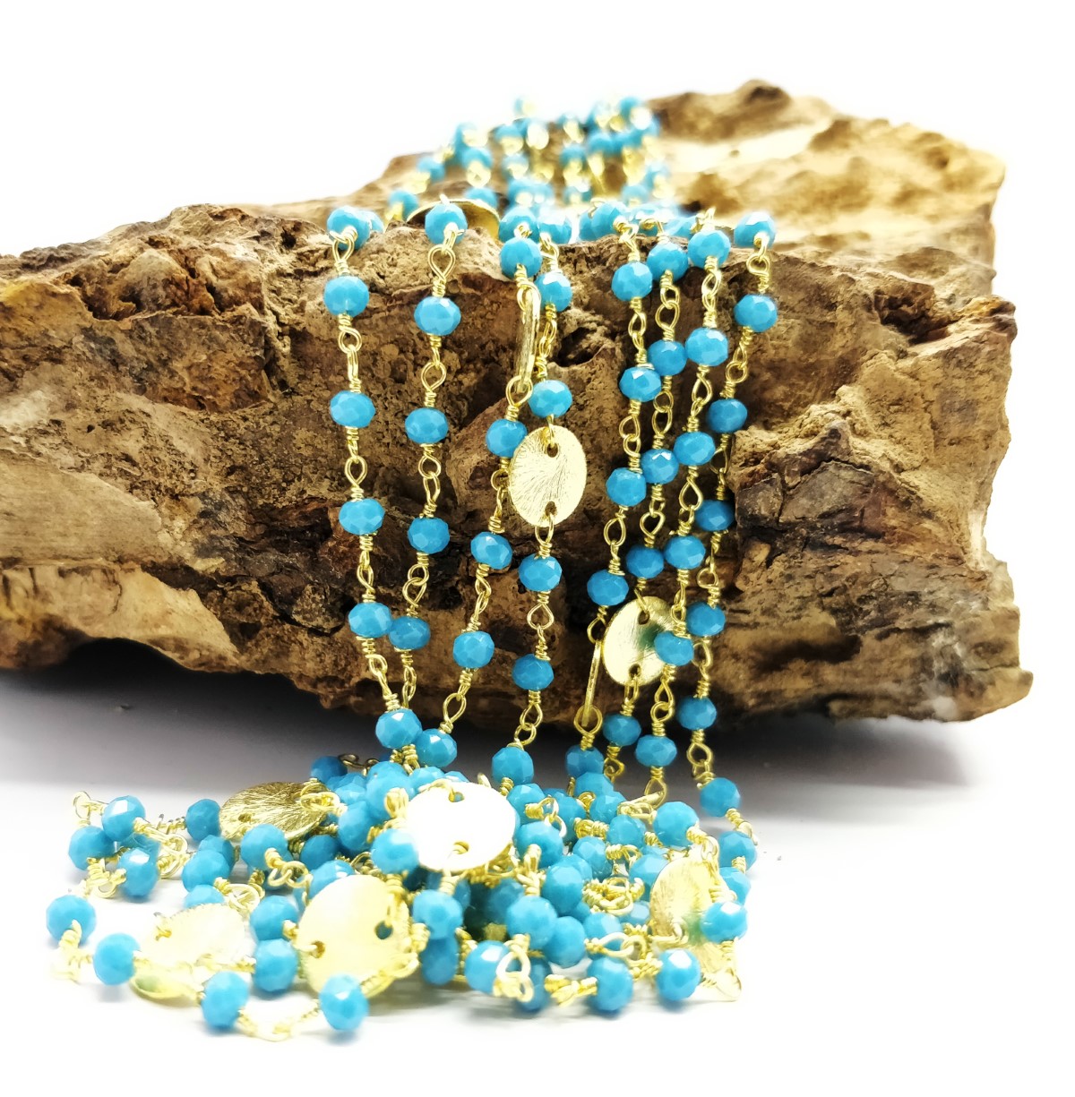The faceted rondelle beads reflect light beautifully. Chalcedony feels smooth, and gold finish looks professionally done.