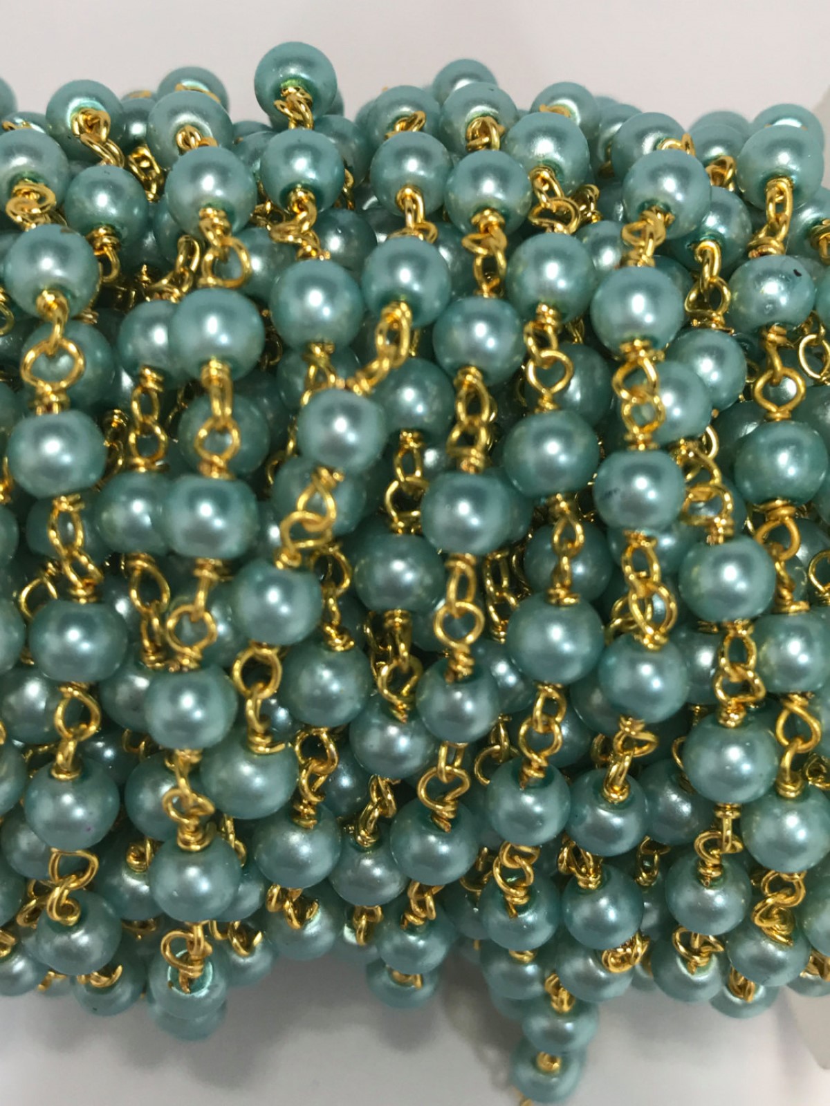 3 Feet Turquoise Green Glass Pearl Rosary Style Chain 4 mm Smooth Bead Linking Beads, Wire Wrapped Linking Beads 24k Gold Plated Acrylic Pearl, Pearled Beads.