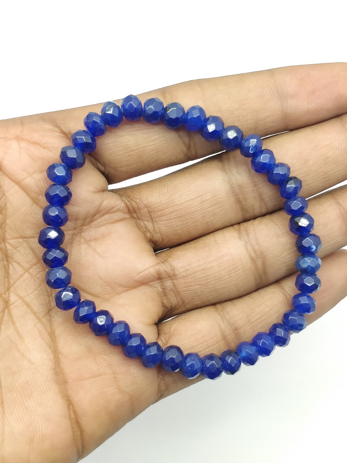 This bracelet features 5.5-6mm faceted blue jade beads that are smooth and polished. The bright blue color, paired with the rondelle design, gives it a polished, radiant look.