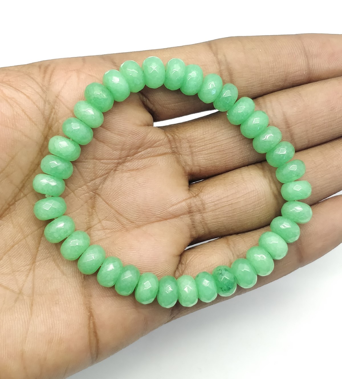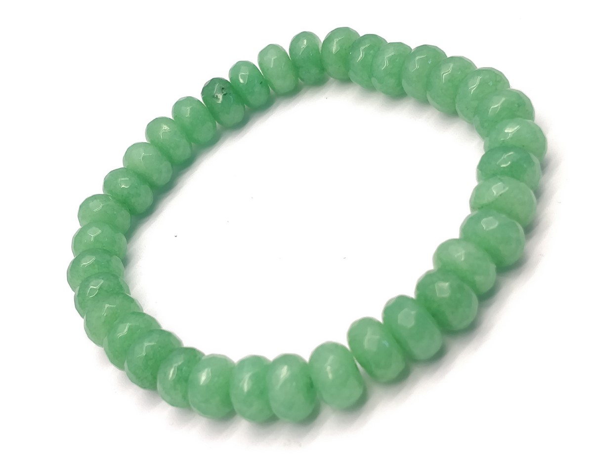 This 7.5-inch bracelet features 35 8mm Emerald Jade beads with rondelle and faceted designs. It adds a luxurious touch to your style, blending beauty and sophistication seamlessly.
